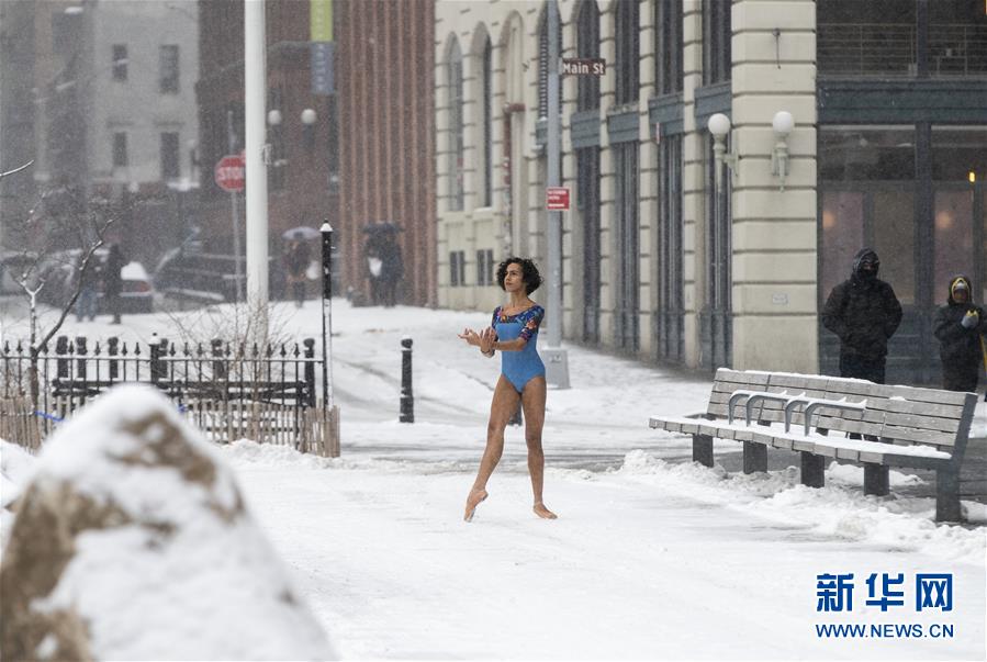2月20日,在美国纽约布鲁克林大桥附近的商业区,一名女孩在雪中拍照。