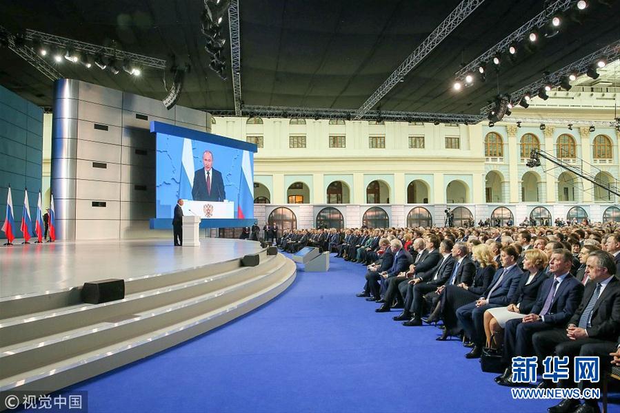 当地时间2019年2月20日,俄罗斯莫斯科,俄罗斯总统普京向议会上下两院发表国情咨文。普京说,俄中关系是国际事务的稳定因素,俄方重视发展俄中关系。(图片来源:视觉中国)