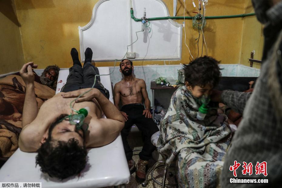 当地时间2018年2月25日,叙利亚东古塔区al-Shifunieh疑遭毒气袭击,一名男子和儿童接受治疗。