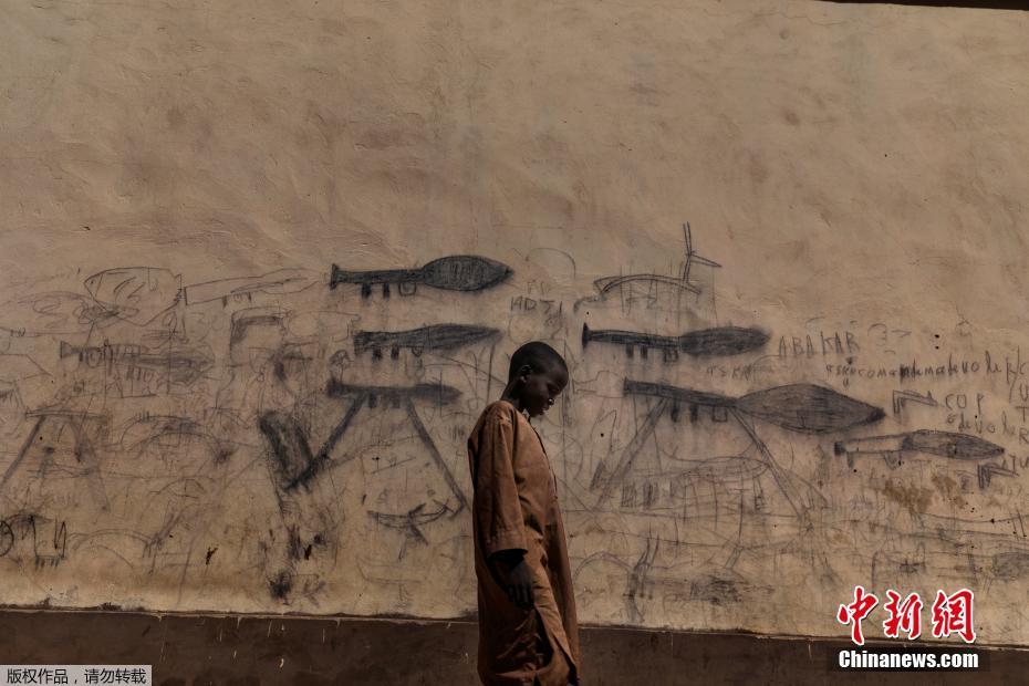 当地时间2018年10月13日,乍得Bol,一名孤儿经过画着榴弹发射器的墙。