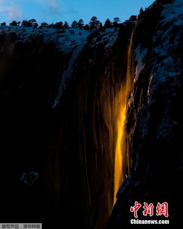 当地时间2月18日,位于美国加州约塞米特国家公园的马蹄铁瀑布在阳光下倾泻而下,远远望去被阳光映红的水流化作一条“火瀑布”悬挂山间。