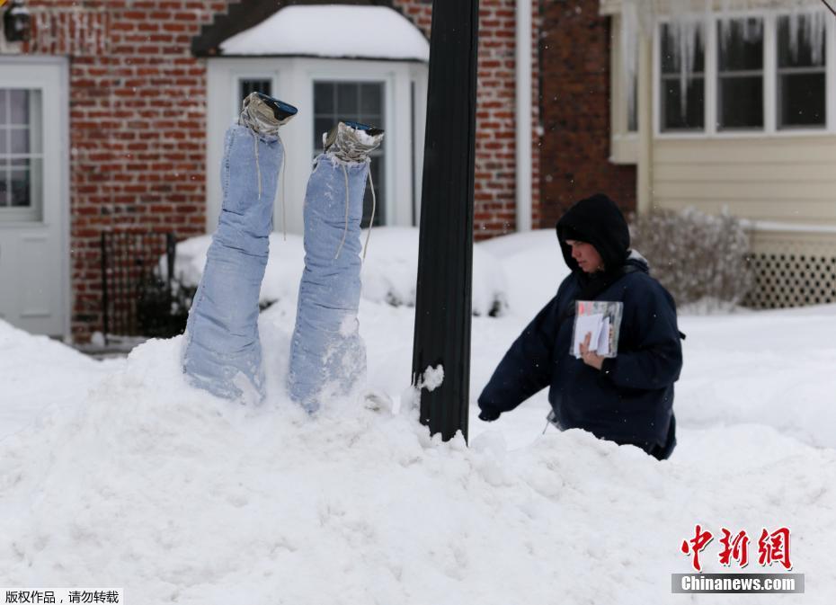 美国多地大雪 居民堆奇葩“倒栽葱”雪人