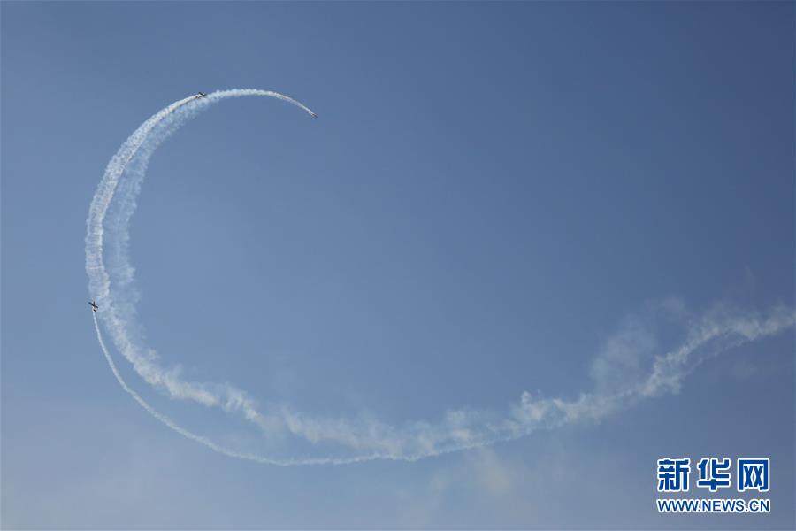 这是2月20日在印度班加罗尔拍摄的航空展上的飞行表演。 新华社记者姜磊摄