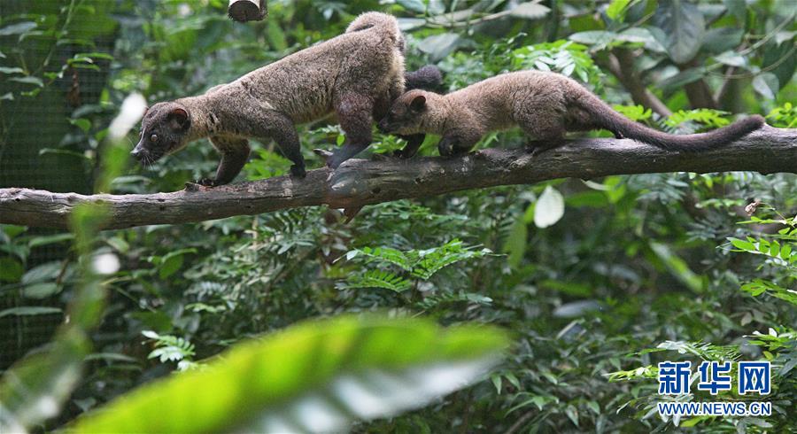 这是2月22日在新加坡夜间动物园里拍摄的小齿椰子猫幼崽(右)和它的母亲。 新华社发(邓智炜摄)
