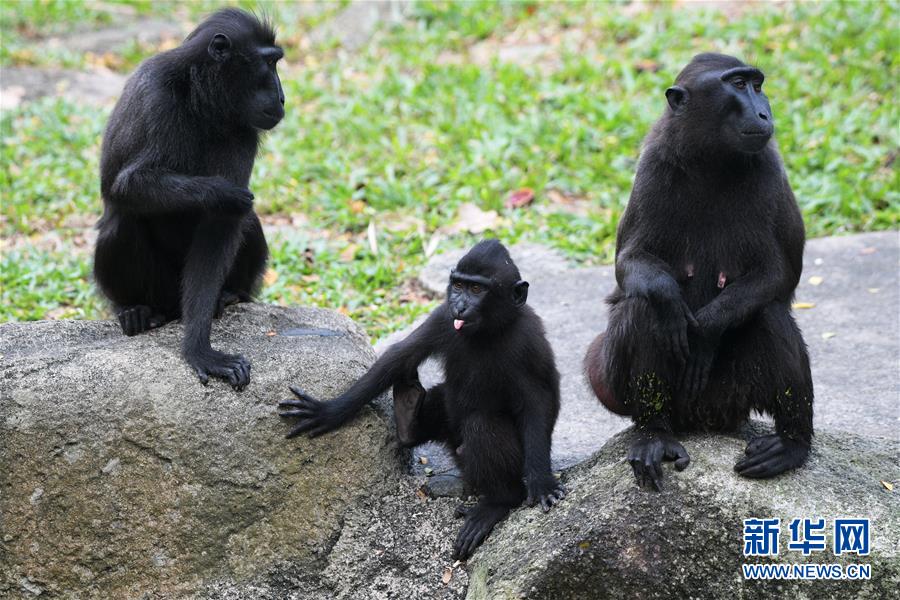 这是2月22日在新加坡动物园拍摄的一只黑冠猕猴幼崽(中)。 新华社发(邓智炜摄)
