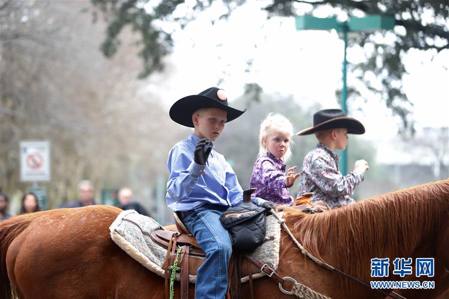 2月23日,在美国休斯敦,小牛仔们骑马行进在游行队伍中。新华社发(宋穹摄)