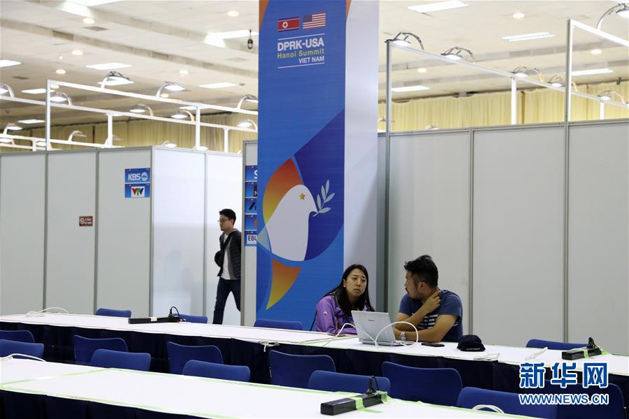 2月24日,在越南首都河内,工作人员在朝美领导人第二次会晤国际媒体中心忙碌。