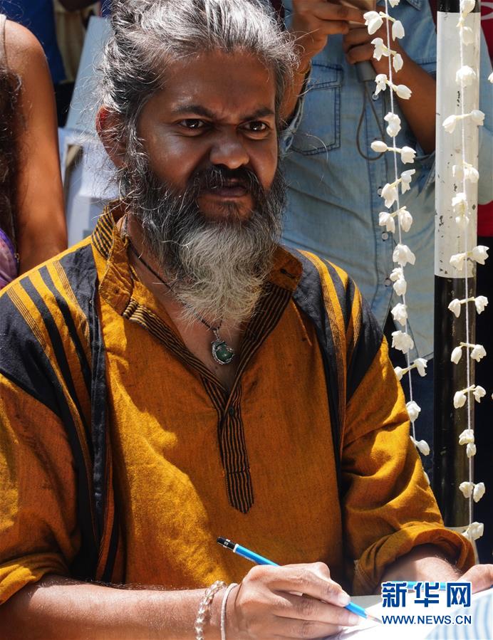 2月24日,在斯里兰卡科伦坡,一名画家在卡拉·波拉户外艺术展上为顾客画肖像。 斯里兰卡卡拉·波拉户外艺术展24日在首都科伦坡最富有艺术气息的街道“绿径”举行。 新华社记者唐璐摄