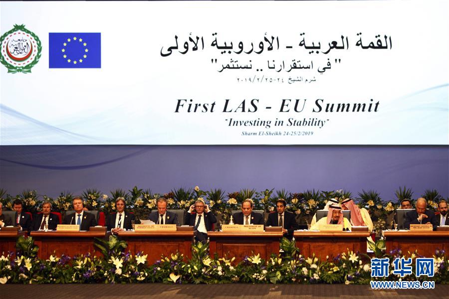 这是2月24日在埃及沙姆沙伊赫拍摄的会议现场。为期两天的首届阿拉伯国家联盟-欧洲联盟峰会24日在埃及红海海滨城市沙姆沙伊赫开幕,来自欧洲和阿拉伯国家的50多名领导人出席会议。新华社发(艾哈迈德·戈马 摄)
