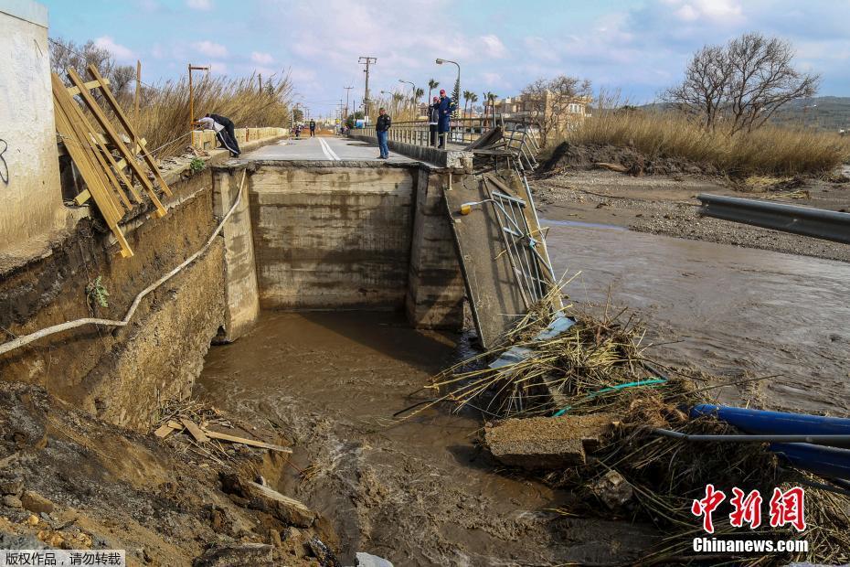 当地时间2月26日,希腊南部克里特岛在遭遇暴雨后,一辆汽车被冲进河流中央。近日,希腊遭遇寒流袭击,多地遭遇暴雨并伴有暴雨和雷暴天气,海陆空交通均受不同程度影响。图为公路中断。