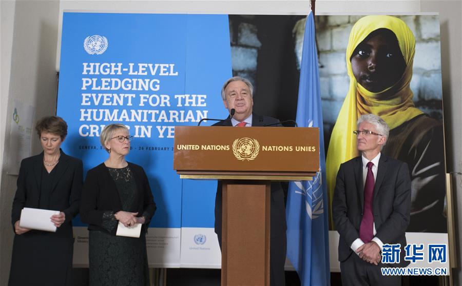 2月26日,在瑞士日内瓦,联合国秘书长古特雷斯(右二)出席记者招待会。新华社记者徐金泉摄