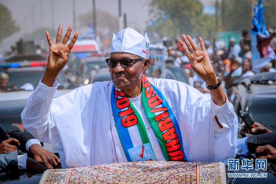 2月14日,在尼日利亚北部卡齐纳州,尼日利亚总统布哈里向支持者挥手致意。 尼日利亚国家独立选举委员会2月27日凌晨宣布,现任总统、全体进步大会党总统候选人布哈里在23日举行的大选中获胜,再次当选尼日利亚总统。 新华社发(奥拉屯基·奥巴萨摄)