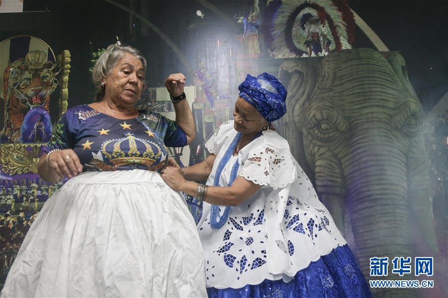 2月25日,在巴西圣保罗,卡门·席尔瓦(右)为克莱德·阿劳若穿戴狂欢节服饰。 72岁的卡门·席尔瓦是巴西一所桑巴舞学校“巴亚纳”舞蹈单元的协调人和裁缝。二月下旬,她花了数晚时间为学校里六十名参加“巴亚纳”舞蹈表演彩排的女子缝制服装。“巴亚纳”舞蹈单元是桑巴舞学校狂欢节游行表演中的一部分,人们会穿着巴西巴伊亚州传统服饰进行表演。 新华社发(拉赫尔·帕特拉索摄)