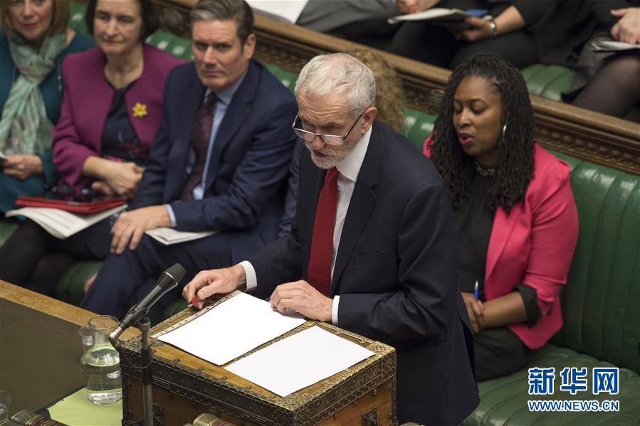 2月27日,在英国伦敦,工党领袖科尔宾(前)出席议会下院的首相问答。 2月27日,英国首相特雷莎·梅在议会下院进行首相问答。特雷莎·梅2月26日说,如果“脱欧”协议在3月的英国议会下院投票中未获通过,且“无协议脱欧”被排除,那么将由议会下院通过投票决定是否推迟“脱欧”。 新华社发(英国议会摄影师马克·达菲摄)