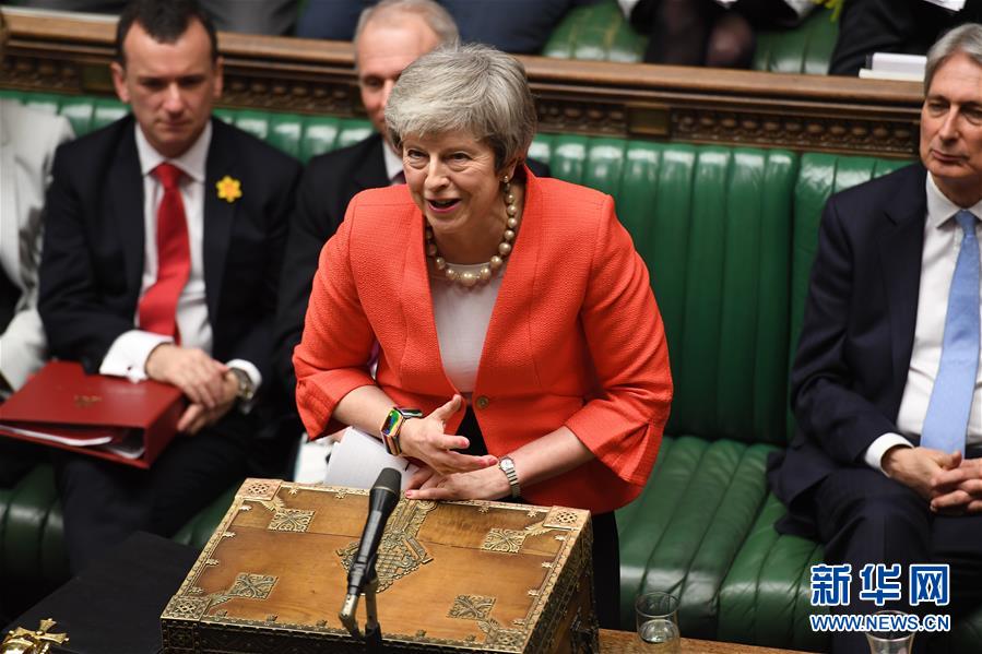 2月27日,在英国伦敦,英国首相特雷莎·梅在议会下院进行首相问答。 2月27日,英国首相特雷莎·梅在议会下院进行首相问答。特雷莎·梅2月26日说,如果“脱欧”协议在3月的英国议会下院投票中未获通过,且“无协议脱欧”被排除,那么将由议会下院通过投票决定是否推迟“脱欧”。 新华社发(英国议会摄影师杰西卡·泰勒摄)