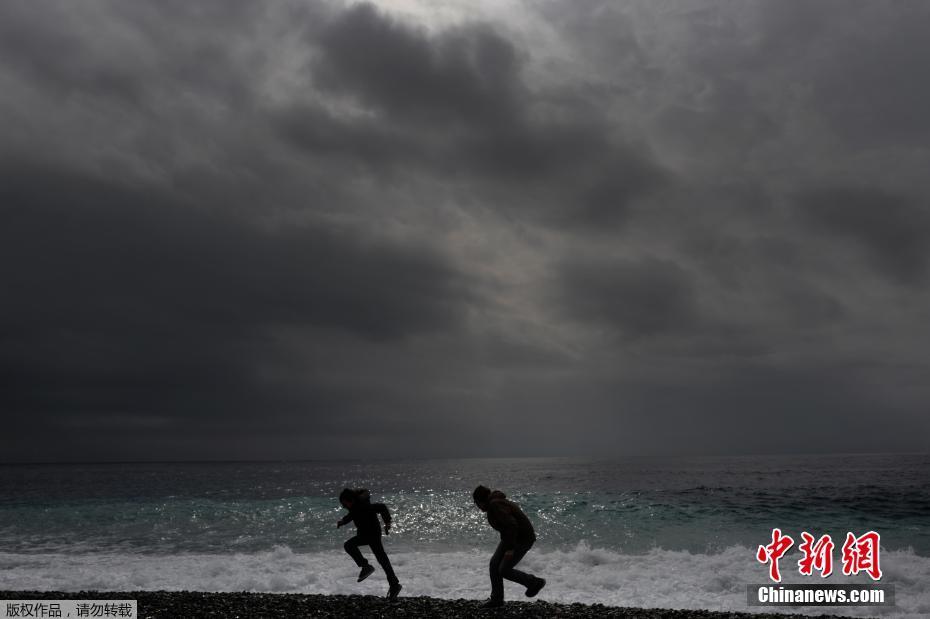法国多地遭强风侵袭 孩童海边悠闲戏浪