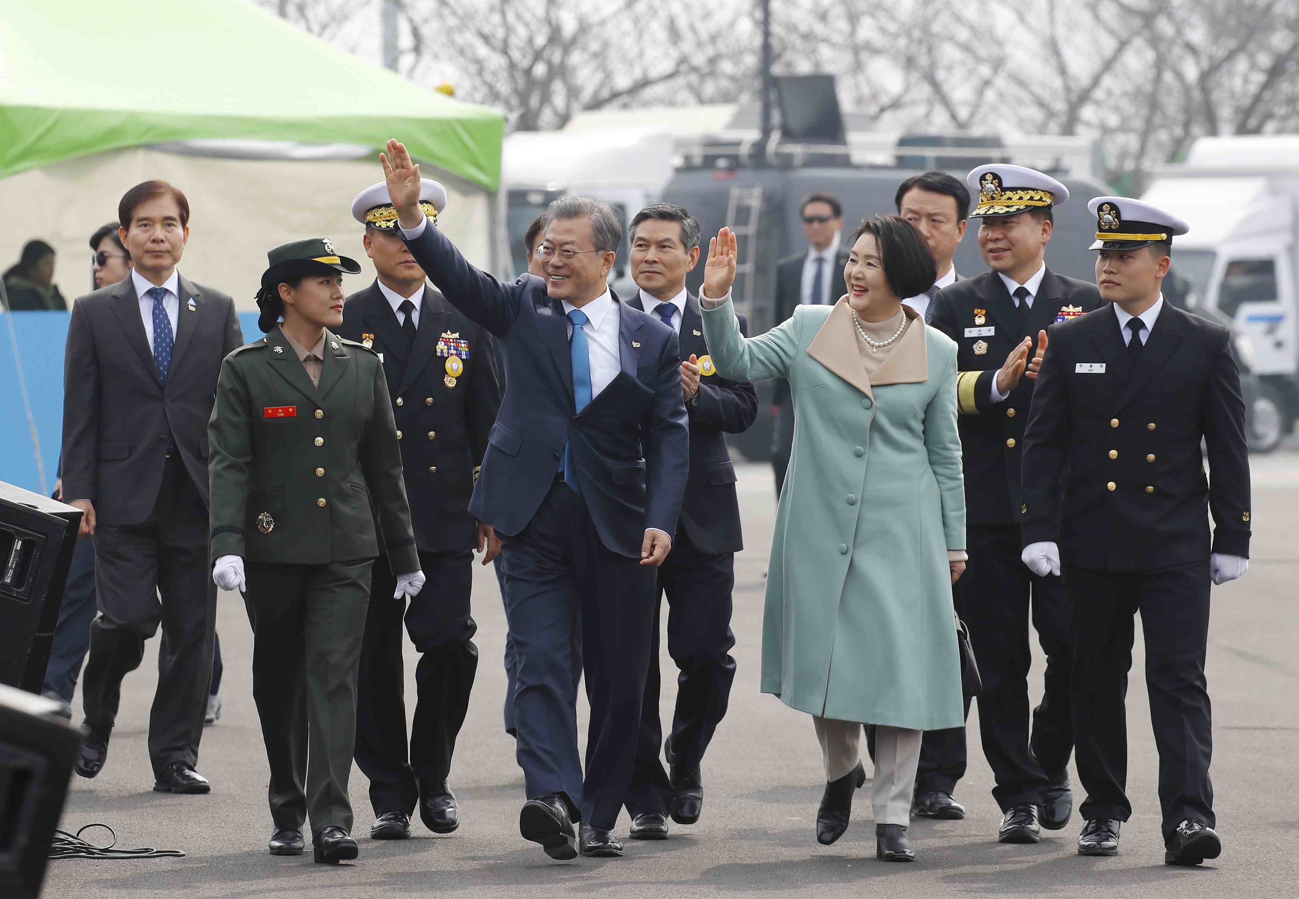 当地时间2019年3月5日,韩国庆尚南道昌原市,韩国总统文在寅出席海军士官学校第73届毕业典礼暨授衔仪式并发表贺词。文在寅夫妇还登上了“独岛”号登陆舰检阅舰艇仪仗队。