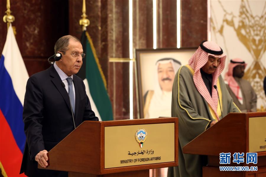 3月6日,在科威特首都科威特城,俄罗斯外长拉夫罗夫(左)和科威特副首相兼外交大臣萨巴赫(右)参加新闻发布会。新华社发(约瑟夫摄)