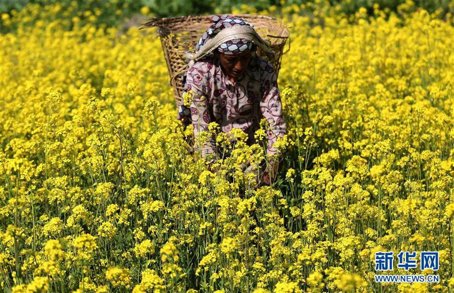 3月6日,在尼泊尔中部勒利德布尔附近的乡间,一名妇女在油菜花盛开的田间劳作。 早春时节,尼泊尔中部谷地的传统农业区已是一派生机勃勃的景象。 新华社发(苏尼尔·夏尔马摄)