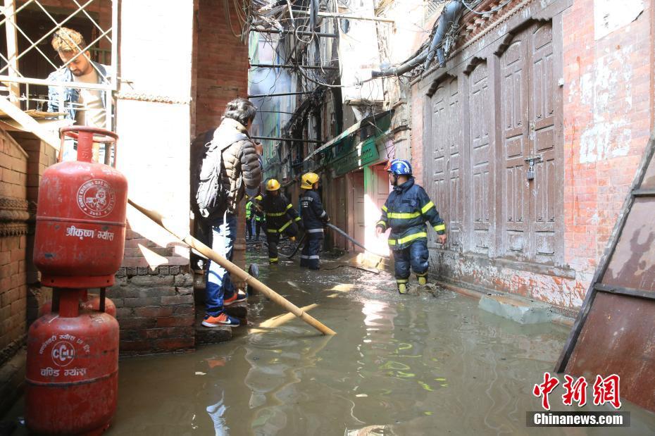 当地时间3月7日中午,尼泊尔首都加德满都杜巴广场附近的2栋居民楼发生火灾,已致3人受伤。图为火灾救援现场。中新社记者 张晨翼 摄