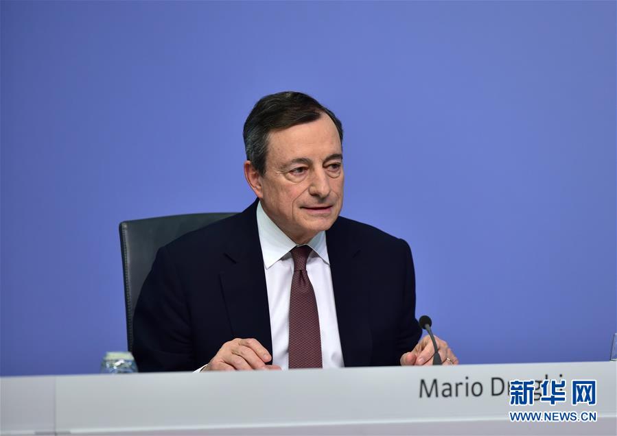 3月7日,在位于德国法兰克福的欧洲中央银行总部,欧洲央行行长德拉吉出席新闻发布会。 欧洲中央银行7日召开例行货币政策会议,继续维持欧元区主导利率为零,并预期在2019年底前不会加息。 新华社记者 逯阳 摄