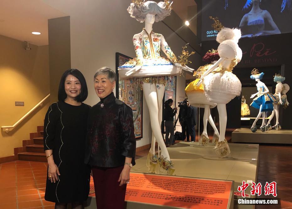 当地时间3月7日,一场名为“郭培:超越时装”的华服盛宴首次亮相美国西海岸。当日上午,“郭培:超越时装”新闻发布会在美国宝尔博物馆举行。曾为2008年北京奥运会设计颁奖礼服、被誉为“中国高级定制服装第一人”的著名服装设计师郭培,现场阐述此次展出的40多件最具代表性作品的创作灵感与设计历程。图为郭培(左)、宝尔博物馆华人董事长施刘秀枝(右)在展品前合影。中新社记者 张朔 摄