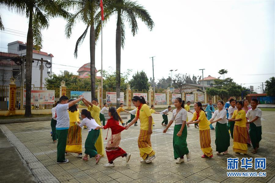 在银井小学,中缅两国学生在课间休息时一起做游戏(3月8日摄)。新华社记者 秦晴 摄