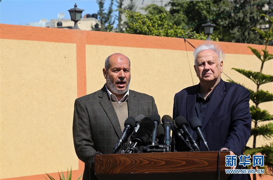 3月7日,巴勒斯坦中央选举委员会主席汉纳·纳赛尔(右)与哈马斯政治局成员哈利勒·哈亚在加沙城举行联合新闻发布会。 巴勒斯坦伊斯兰抵抗运动(哈马斯)7日表示,巴立法委员会(议会)选举和总统选举应一并讨论,不应分开。 新华社发