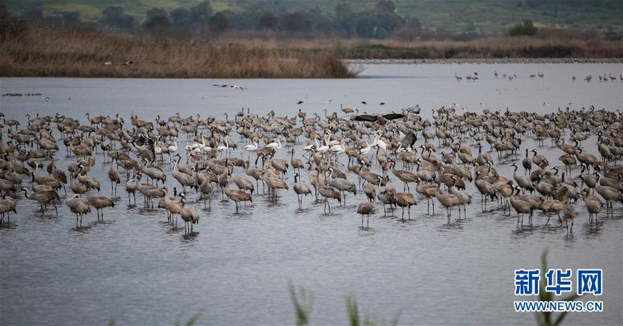 3月7日,在以色列阿格蒙胡拉鸟类和自然公园,一群火烈鸟(白色)和灰鹤在湿地里休息。 位于以色列北端的胡拉谷地冬季气候相对温暖湿润,食物来源充足,是候鸟在欧洲和非洲之间迁徙的重要中转站。20世纪90年代,当地农民、以色列农业部和自然保护组织共同设立阿格蒙胡拉鸟类和自然公园,在指定的地点给候鸟喂食,既能保护周边农田的庄稼不被候鸟啄食,又能为迁徙的候鸟补充之后旅程所需的能量,成为候鸟“加油站”。 新华社记者 郭昱 摄