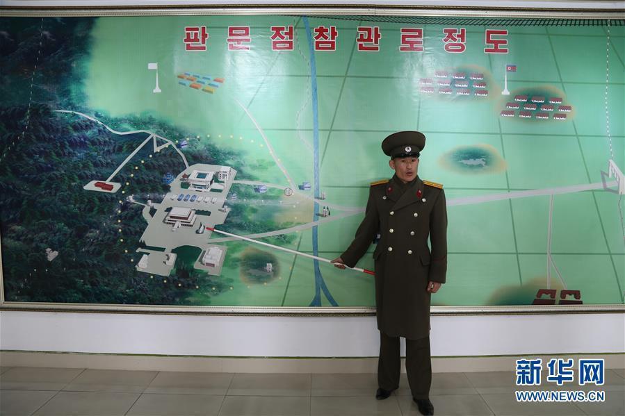 3月5日,在朝鲜板门店,板门店解说员、朝鲜人民军陆军中校黄炳进介绍板门店基本情况和参观路线。板门店是朝鲜半岛上最著名的地点之一。这个过去不起眼的地方由于成为朝鲜战争的主要谈判地点而闻名,过去几十年也是朝韩美三方明争暗斗的角力场,上演过许多惊心动魄的历史事件。如今,它又以新的姿态为推动朝韩和平统一、共建半岛繁荣发挥着重要作用。 新华社记者 程大雨 摄 图片来源:新华网