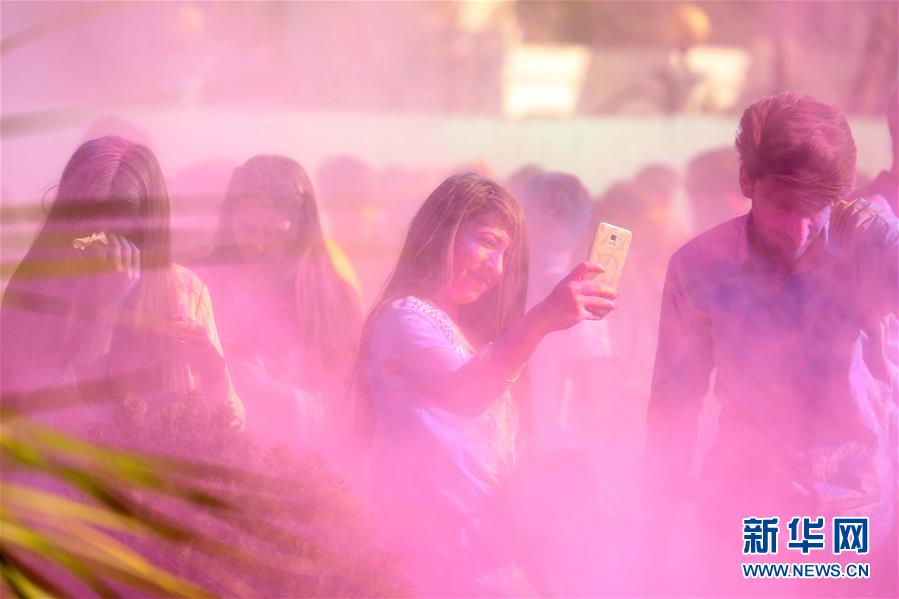 3月9日,在巴基斯坦伊斯兰堡,一名女孩在色彩节活动上自拍,欢庆春天的到来。 新华社发(艾哈迈德·卡迈勒摄)