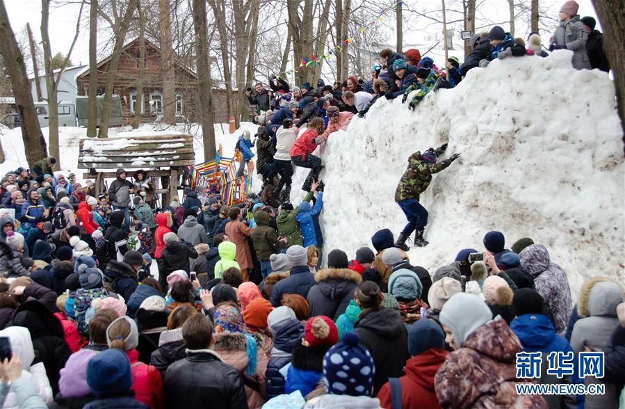 3月10日,在俄罗斯下诺夫哥罗德,人们做游戏庆祝“谢肉节”。“谢肉节”又称送冬节,俄罗斯各地民众在节日期间做游戏、吃薄饼、烧稻草人,迎接春天的到来。新华社发(安德烈 摄)
