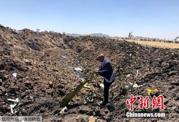 当地时间3月10日,埃塞俄比亚比绍夫图镇(Bishoftu)附近的坠机地点,大型机械设备进驻现场。据报道,埃塞俄比亚航空失事客机ET302坠落现场仅可看见一个直径约50米深度约10米的巨大深坑,目前有两台挖掘机和一台装载机在进行救援工作,不断挖出机翼部位残骸碎片。据参与救援人员介绍,失事飞机机头深深扎入地下,目前还未挖出。机身残骸散落范围达周边一万平米区域,黑匣子仍未找到。图为埃塞俄比亚航空公司CEO在失事现场查看飞机残骸。文字来源:央视新闻、北京青年报