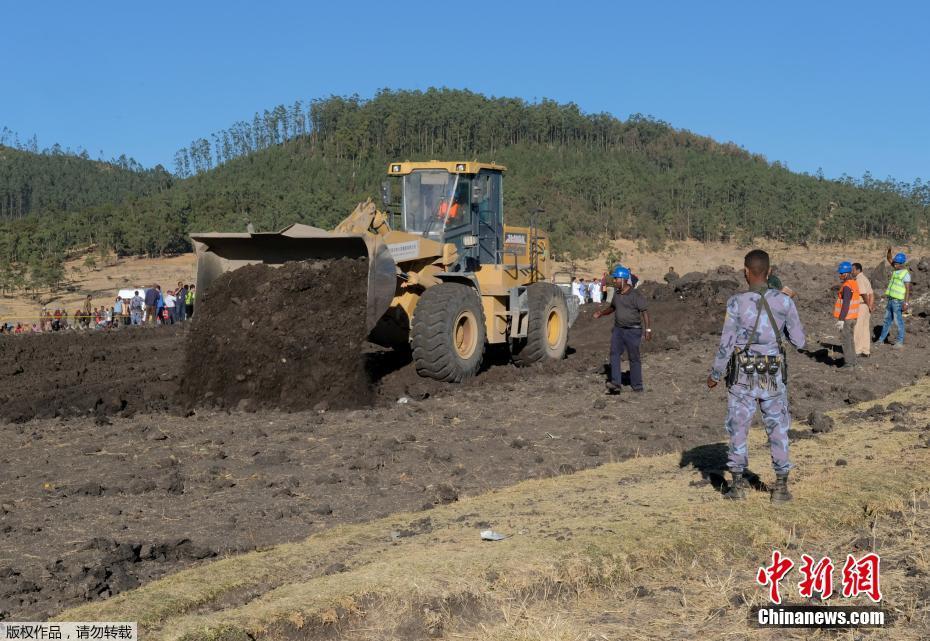 当地时间3月10日,埃塞俄比亚比绍夫图镇(Bishoftu)附近的坠机地点,大型机械设备进驻现场。据报道,埃塞俄比亚航空失事客机ET302坠落现场仅可看见一个直径约50米深度约10米的巨大深坑,目前有两台挖掘机和一台装载机在进行救援工作,不断挖出机翼部位残骸碎片。据参与救援人员介绍,失事飞机机头深深扎入地下,目前还未挖出。机身残骸散落范围达周边一万平米区域,黑匣子仍未找到。图为救援现场。文字来源:央视新闻、北京青年报