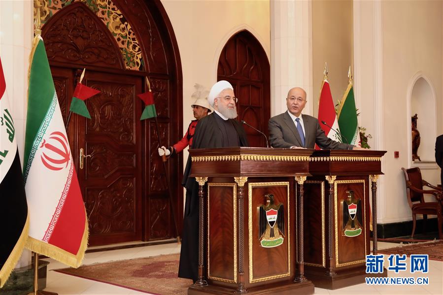 3月11日,在伊拉克巴格达,伊拉克总统萨利赫(右)和伊朗总统鲁哈尼出席新闻发布会。伊拉克总统萨利赫11日说,实现伊拉克、伊朗和其他中东地区国家的共同安全需要更多合作。萨利赫当天在首都巴格达同到访的伊朗总统鲁哈尼举行会谈,双方讨论了两国边境、水资源、开展石油和天然气合作等议题。 新华社发(哈利勒·达伍德摄)