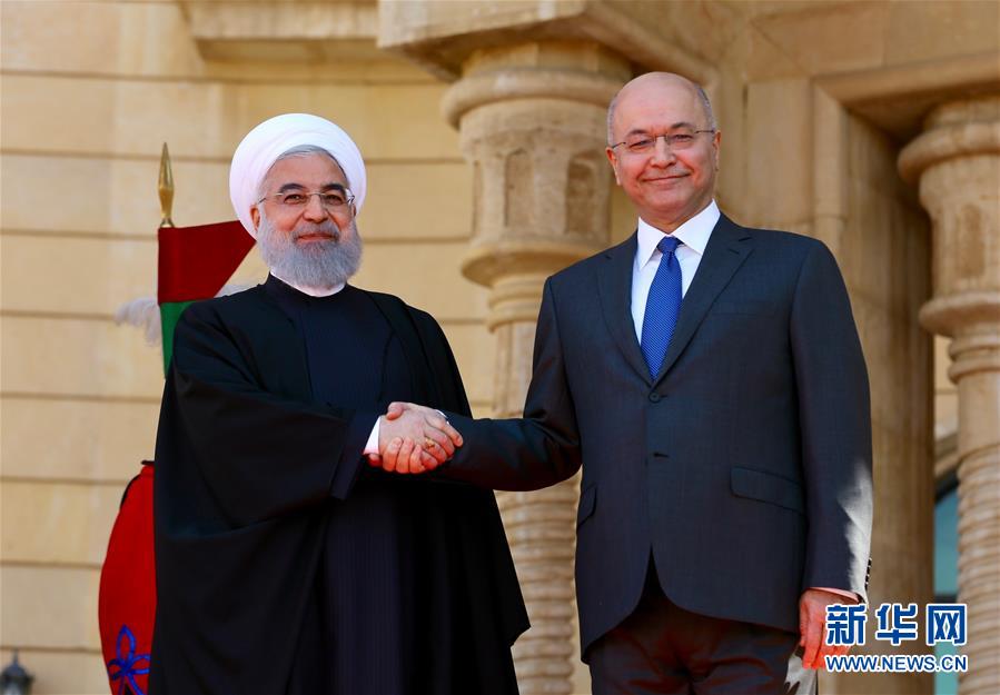 3月11日,在伊拉克巴格达,伊拉克总统萨利赫(右)迎接伊朗总统鲁哈尼。伊拉克总统萨利赫11日说,实现伊拉克、伊朗和其他中东地区国家的共同安全需要更多合作。萨利赫当天在首都巴格达同到访的伊朗总统鲁哈尼举行会谈,双方讨论了两国边境、水资源、开展石油和天然气合作等议题。 新华社发(哈利勒·达伍德摄)