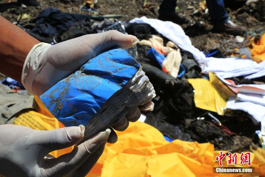 3月12日,埃塞俄比亚航空公司失事航班ET302的救援工作基本结束。图为救援人员在事故现场发现联合国工作人员的护照。中新社记者 王曦 摄