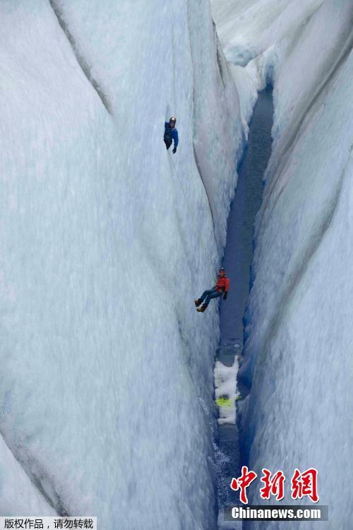 近日,几名法国科学家探险智利南部巴塔哥尼亚Madre de Dios群岛,攀冰穿洞,场面惊险刺激。这里几乎每天都会下大雨,强风和冰川融化退缩让群岛在1.2万年以前就成为了一片地质天堂。智利政府积极寻求联合国教科文组织为Madre de Dios群岛授予世界自然遗产名地位。图为科学家在冰上攀爬。