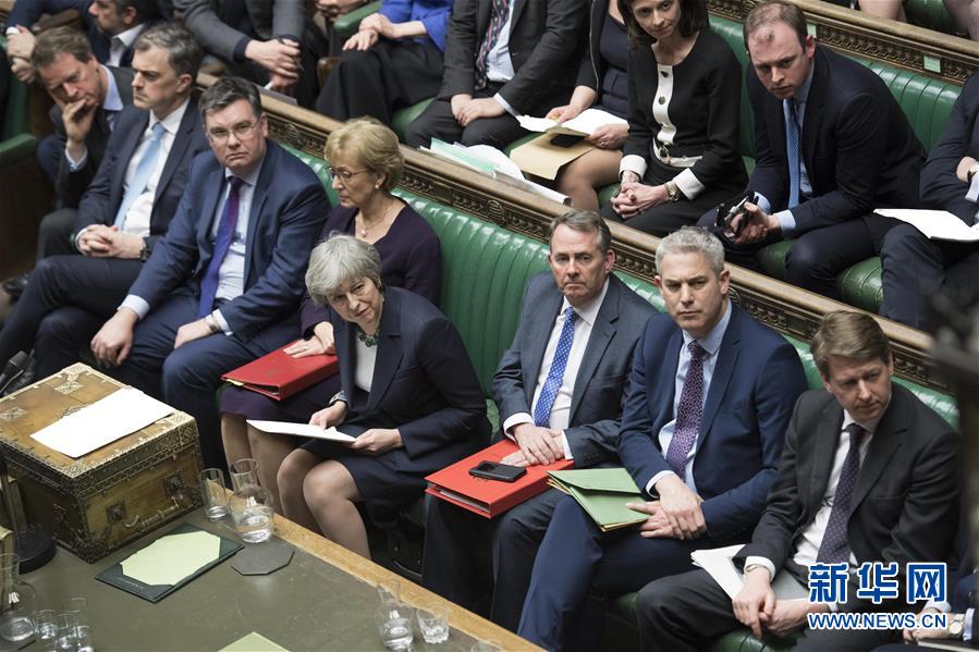 3月13日,在英国伦敦,英国首相特雷莎·梅(中)出席议会下院投票。英国议会下院13日投票决定,反对英国在任何情况下“无协议脱欧”。 新华社发(英国议会摄影师杰西卡·泰勒)