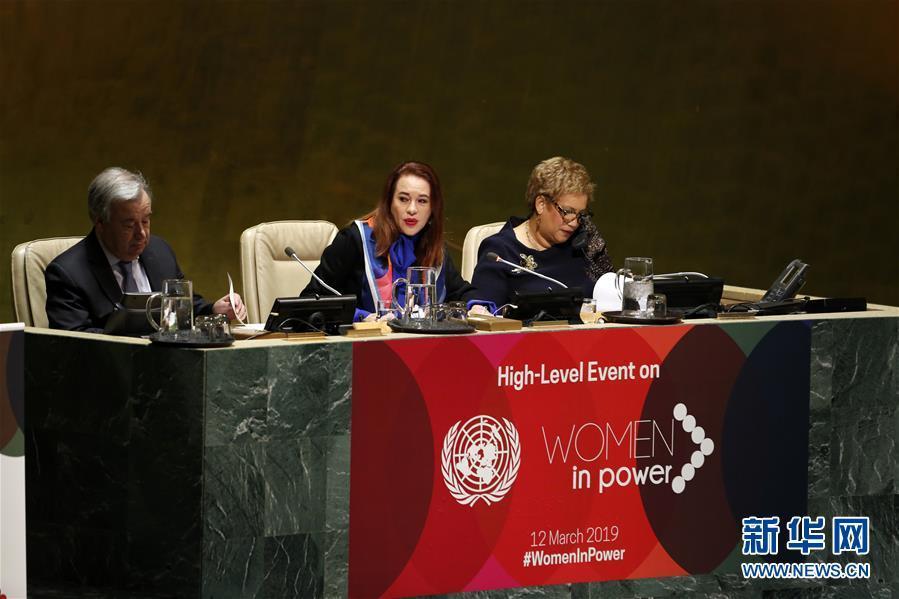 3月12日,联合国大会厅,来自全球的有影响力的女性齐声表示:为实现性别平等,“冲破制约”。图为第73届联合国大会主席埃斯皮诺萨(中)主持“掌权女性”高级别活动。新华社记者 李木子 摄 图片来源:新华网