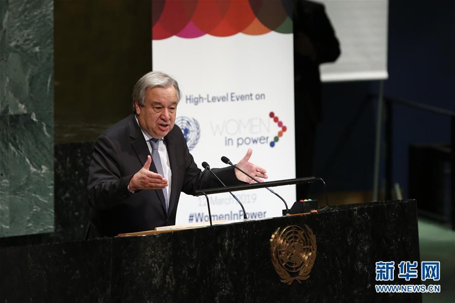 3月12日,联合国大会厅,来自全球的有影响力的女性齐声表示:为实现性别平等,“冲破制约”。图为联合国秘书长古特雷斯在“掌权女性”高级别活动上发言。新华社记者 李木子 摄 图片来源:新华网