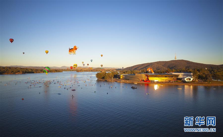 3月11日,在澳大利亚堪培拉,热气球飞过格里芬湖上空。 堪培拉热气球节于3月9日至17日举行。 新华社发(潘翔越摄)