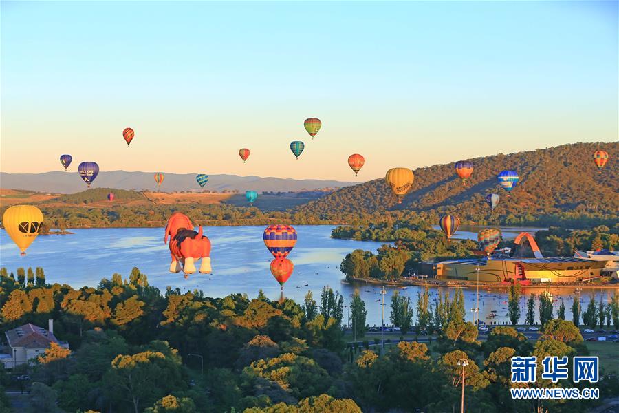 3月12日,在澳大利亚堪培拉,热气球飞过格里芬湖上空。 堪培拉热气球节于3月9日至17日举行。 新华社发(潘翔越摄)