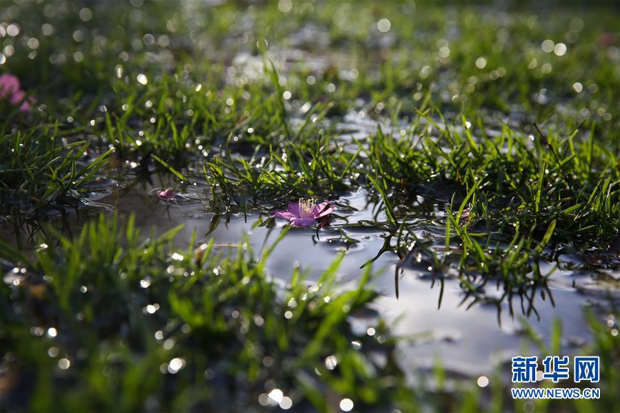 3月14日,在比利时布鲁塞尔五十周年纪念公园,花朵落在水面上。 新华社记者郑焕松摄