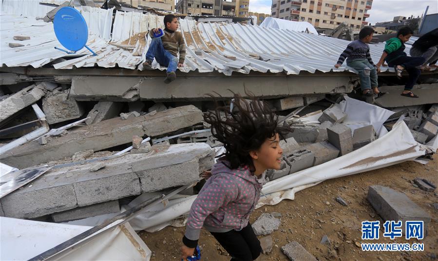 3月15日,在加沙城,巴勒斯坦儿童在空袭过后的废墟玩耍。新华社发(亚西尔摄)