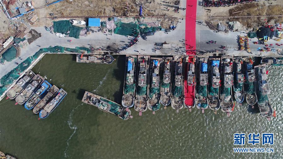 这是3月16日无人机拍摄的二界沟中心渔港内准备出海的渔船。 当日,“中国·盘锦第四届二界沟开海节”在辽宁省盘锦市大洼区二界沟街道举行,当地群众表演精心准备的各类民俗文化节目,期盼在新的一年中一帆风顺、鱼虾丰收。 新华社记者潘昱龙摄