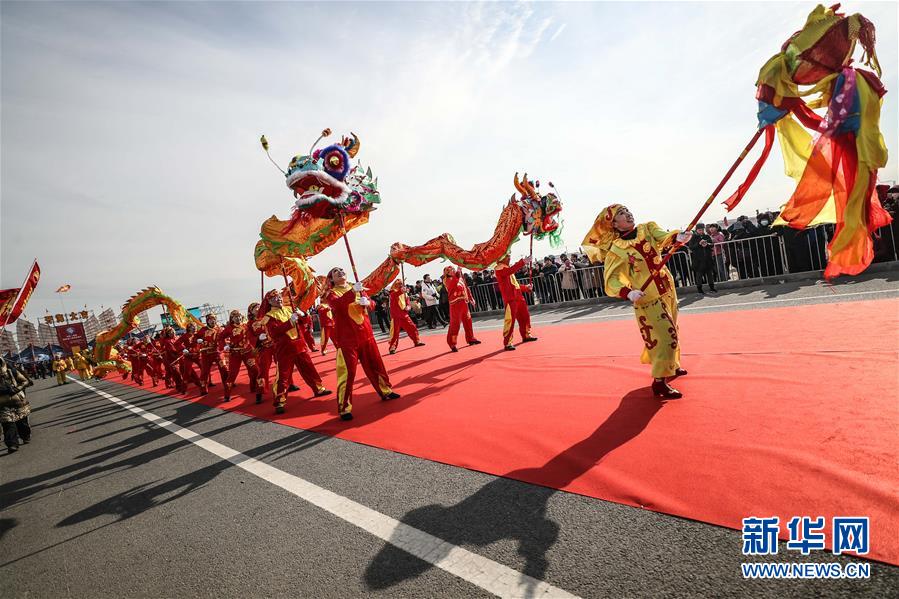 3月16日,二界沟街道当地群众表演舞龙。 当日,“中国·盘锦第四届二界沟开海节”在辽宁省盘锦市大洼区二界沟街道举行,当地群众表演精心准备的各类民俗文化节目,期盼在新的一年中一帆风顺、鱼虾丰收。 新华社记者潘昱龙摄