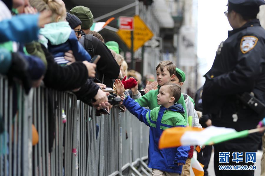 3月16日,在美国纽约,参加圣帕特里克节大游行的小朋友与观众互动。 当日,圣帕特里克节大游行在纽约第五大道举行。每年3月17日的圣帕特里克节是爱尔兰传统节日,为纪念爱尔兰守护神圣帕特里克而设立。 新华社记者王迎摄