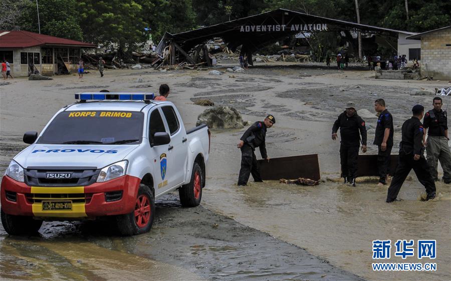 3月17日,在印度尼西亚巴布亚省森塔尼,警察在清理受灾地区。