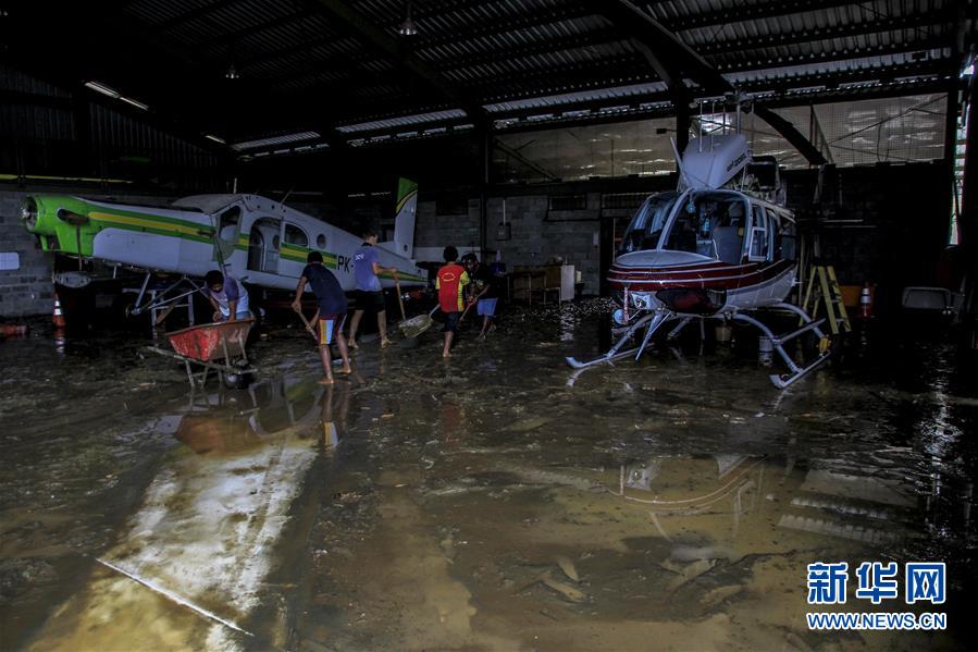 3月17日,在印度尼西亚巴布亚省森塔尼,人们在一个机库中清理洪水过后的污泥。